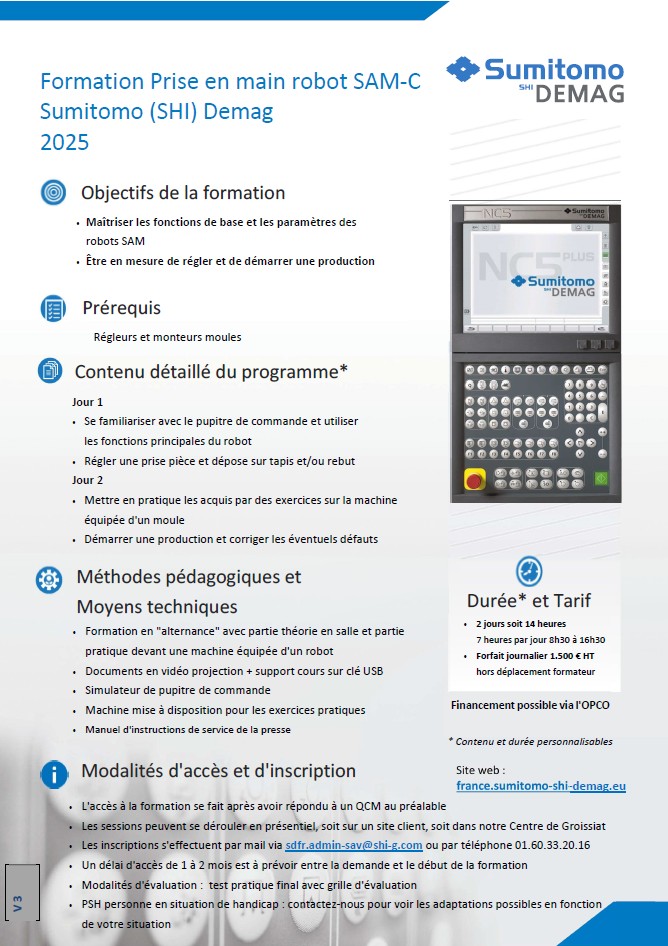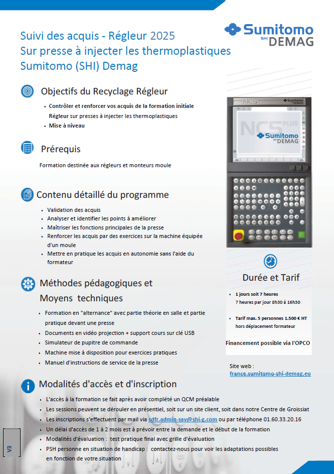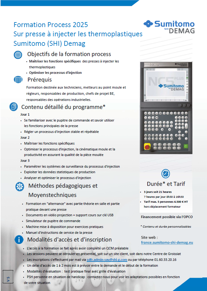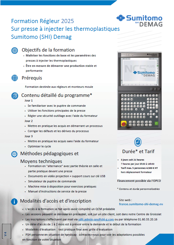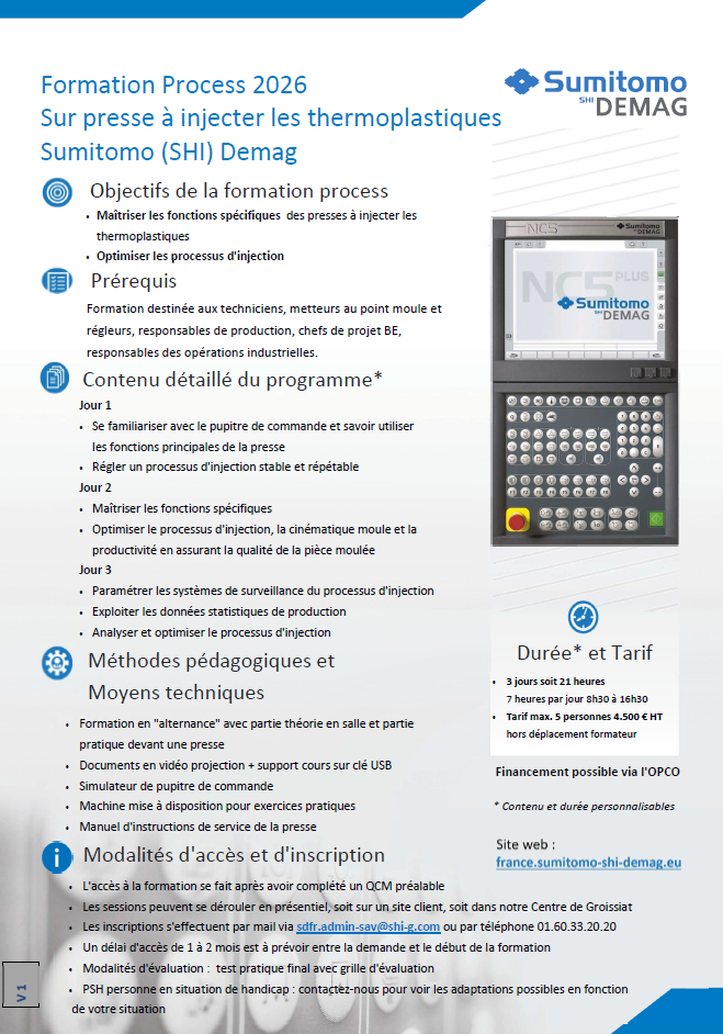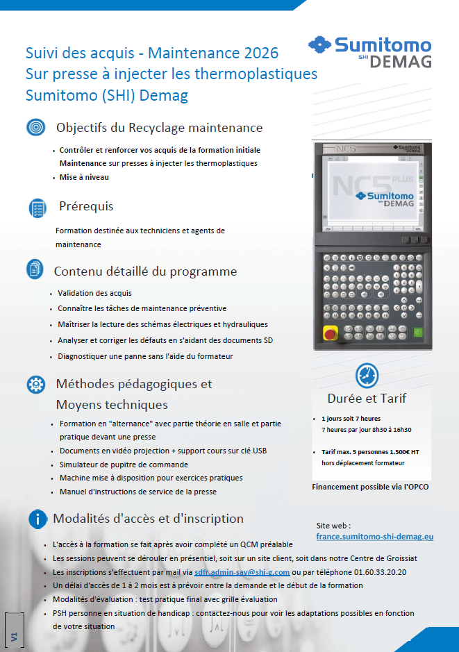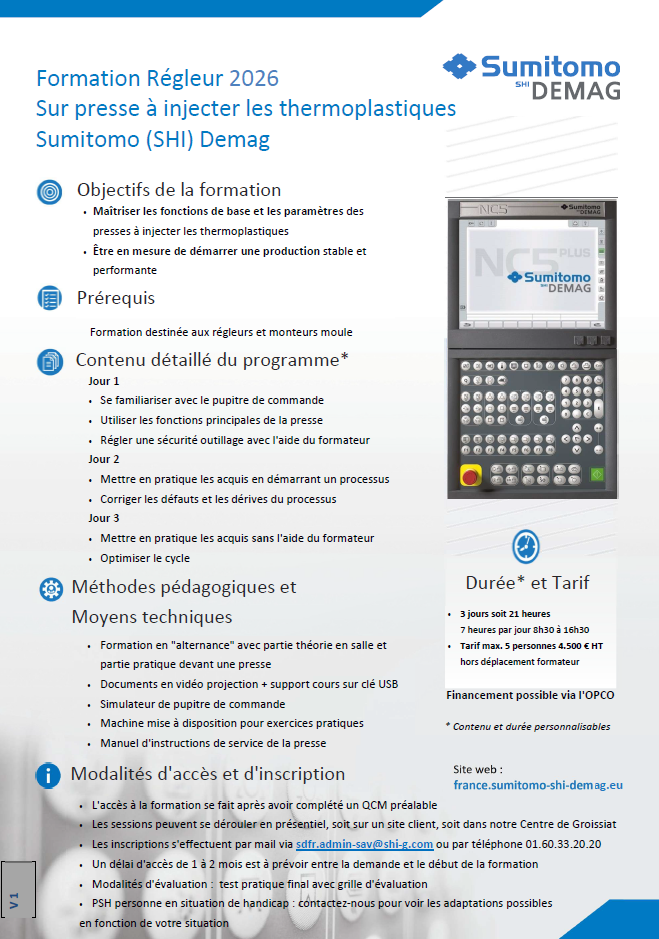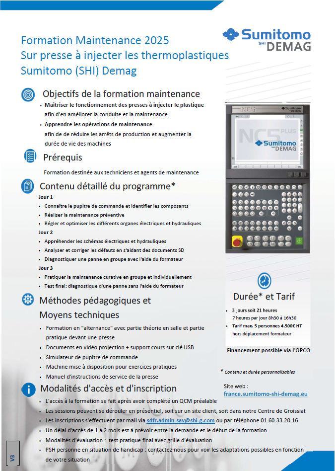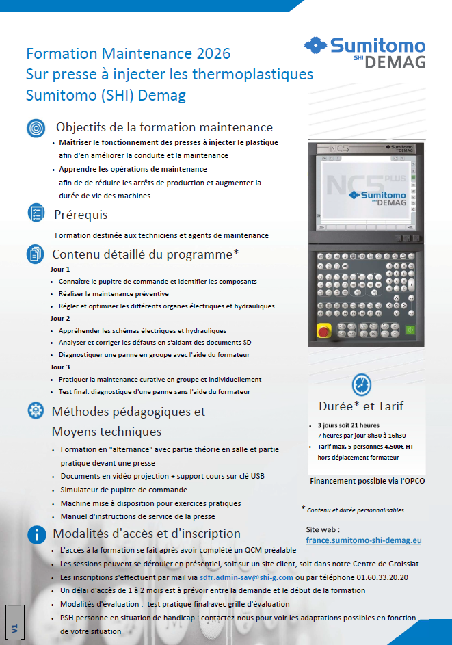 Investir dans la formation pour une utilisation plus efficace de nos produits permet d'améliorer rapidement les processus, la productivité et d'obtenir un retour sur investissement rapide. Pour que votre presse Sumitomo (SHI) Demag fournisse un maximum de rentabilité, nous formons avec efficacité vos techniciens, régleurs, opérateurs et ingénieurs en petits groupes sur des programmes pré établis Maintenance, Régleur et Process. Outre les formations standards en intra ou inter-entreprises, nous pouvons également adapter le contenu et les objectifs de nos formations à vos besoins spécifiques.