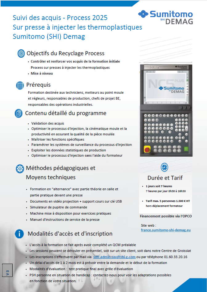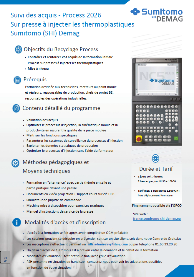 S'appuyant sur Christian Sielanczyk pour l'Expertise Process et sur David Mermet et Loïc Michelin pour les formations Maintenance, Régleur, nos formations peuvent se passer sur votre site ou à notre centre de formation et d'application situé à Groissiat près d'Oyonnax. Une presse à injecter Tout-Electrique IntElect 50T, avec pupitre de commande NC5 dernière génération est à disposition.